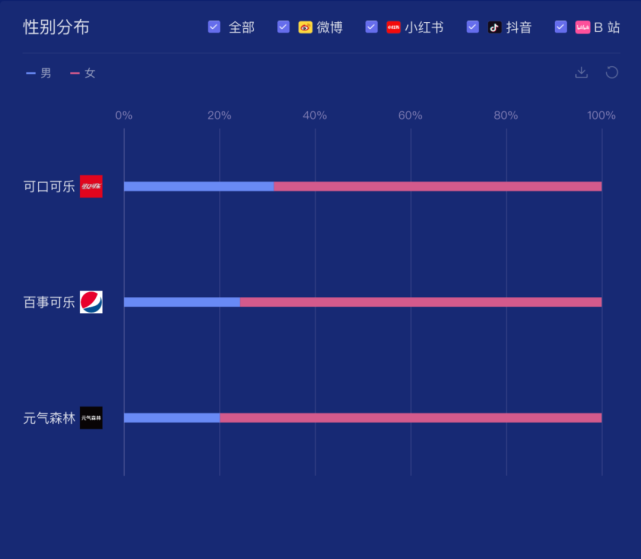 相比可口可乐、百事可乐和元气森林,元气森林男性群体仅有20%,80%为女性群体,对于品牌而言,需要结合竞品和自身品牌人群特性,明确自身想要拓展的消费群体,对于可乐这一品类而言,男性粉丝应该是品牌极力争夺的群体。