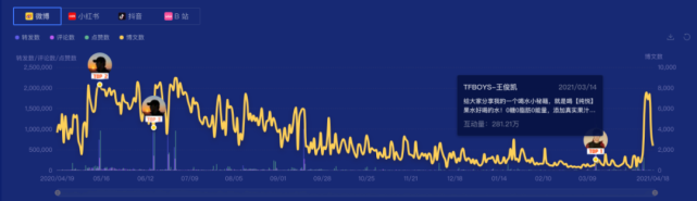 根据时趣洞察引擎,2020.04.19-2021.04.18区间监测,“百事可乐”的社交声量趋势局部攀升、局部平稳,在去年12月18日有一个陡增,主要是品牌年末营销战役。
