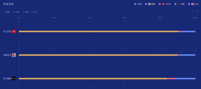 结合时趣洞察引擎数据显示,百事可乐和可口可乐的营销战场投入比重几乎一致,将近90%在微博平台,6%-7%在抖音,2%在小红书,仅有1%左右在B站。相比之下,元气森林不到85%在微博,抖音占比将近10%,小红书5%左右,剩下1%左右在B站。