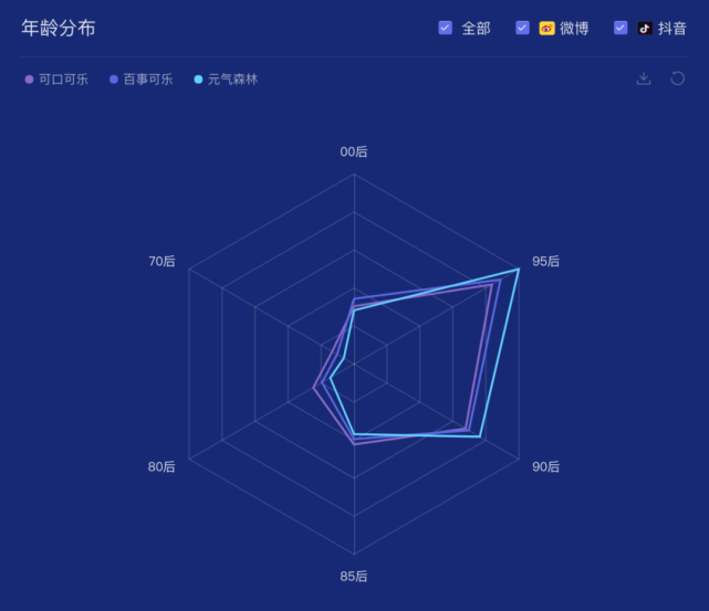 根据时趣洞察引擎,对于“百事可乐”和“可口可乐”粉丝群体的监测,不同年代用户划分几乎趋同,但是相比之下,百事可乐的95后群体占比更多一些,可口可乐在70后、80后群体中,更占一些优势。